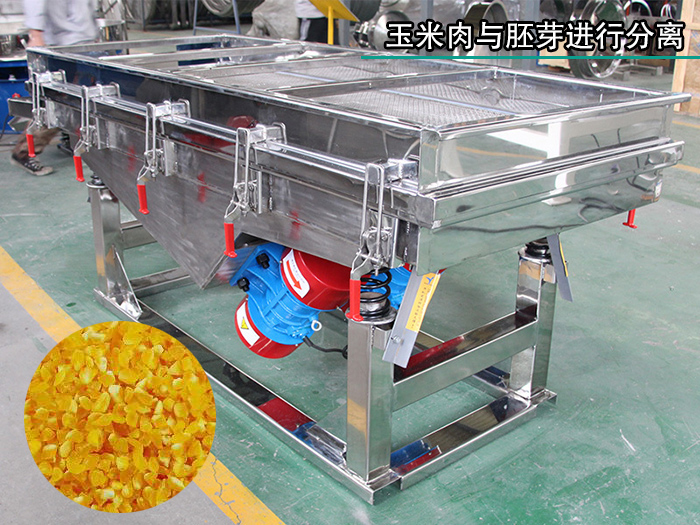 玉米淀粉的提取主要是从,玉米肉中提取的。而胚芽只是玉米粒中的种子部分没有提取的必要,所以要把玉米肉于胚芽进行分离。这里又要用到振动筛分机了。由于这个环节的玉米是经过浸泡的其可以使用不锈钢直线筛分机了,因为这个环节的玉米以及不是完整的了,其需要注意卫生所以小编选用了:不锈钢的直线振动筛。