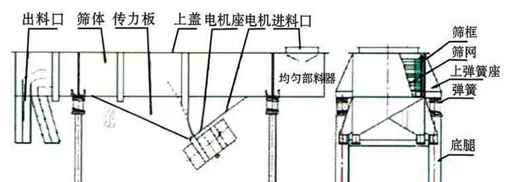 主要由筛箱、筛框、筛网、振动电机、电机台座、减振弹簧、支架等组成。