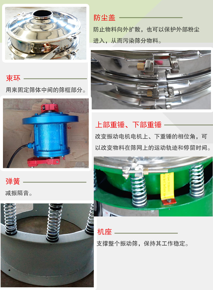 旋振筛主要由进料口、防尘盖、出料口、束环、筛网、配重块、上部重锤、振动体、振动电机、弹簧、下部重锤、机座等部分组成。